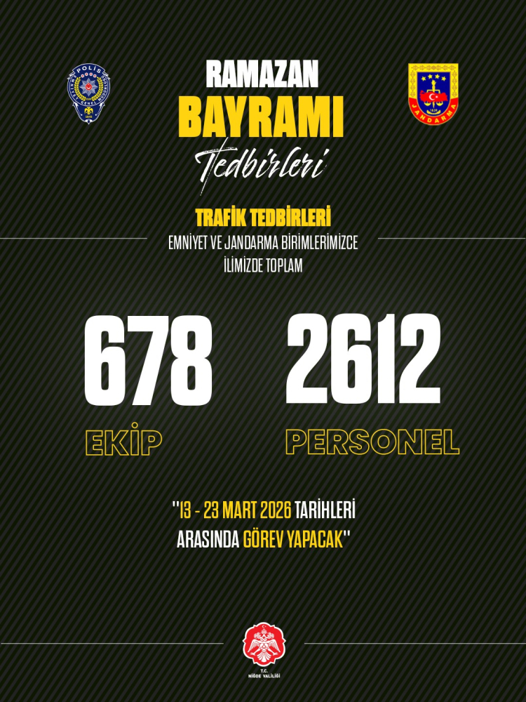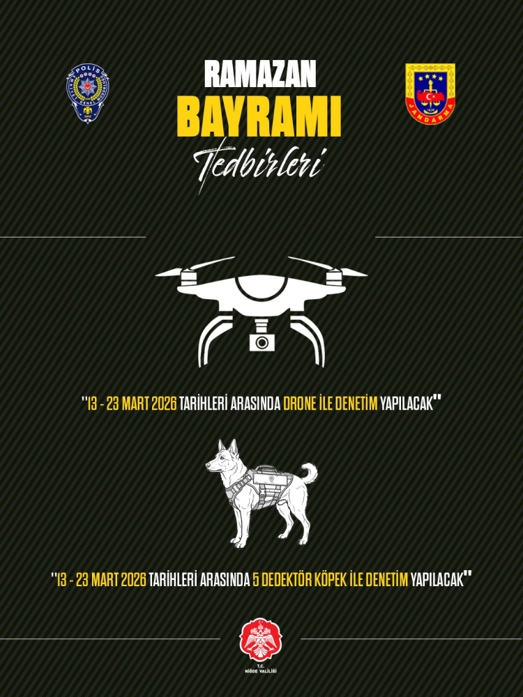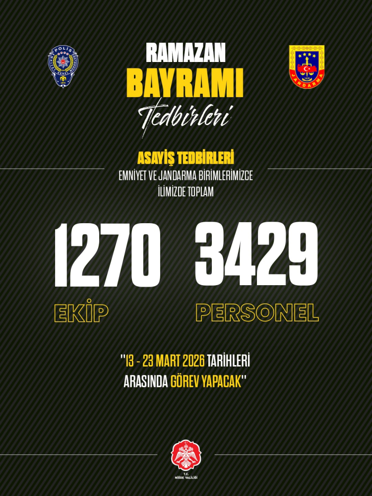 Niğde'de Ramazan Bayramı güvenliği için geniş kapsamlı tedbirler alındı. 1270 ekip ve 3429 personel görev yapacak. Asayiş, trafik denetimleri artırıldı, drone destekli kontroller başlatıldı. Dedektör köpekler ve sağlık ekipleri de hazır.