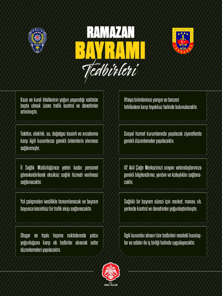 Niğde Valiliği tarafından yapılan açıklamada, vatandaşların huzuru ve güvenliğinin her şeyden önce geldiği vurgulanarak, tüm kurumların bayram süresince sahada olacağı ifade edildi.