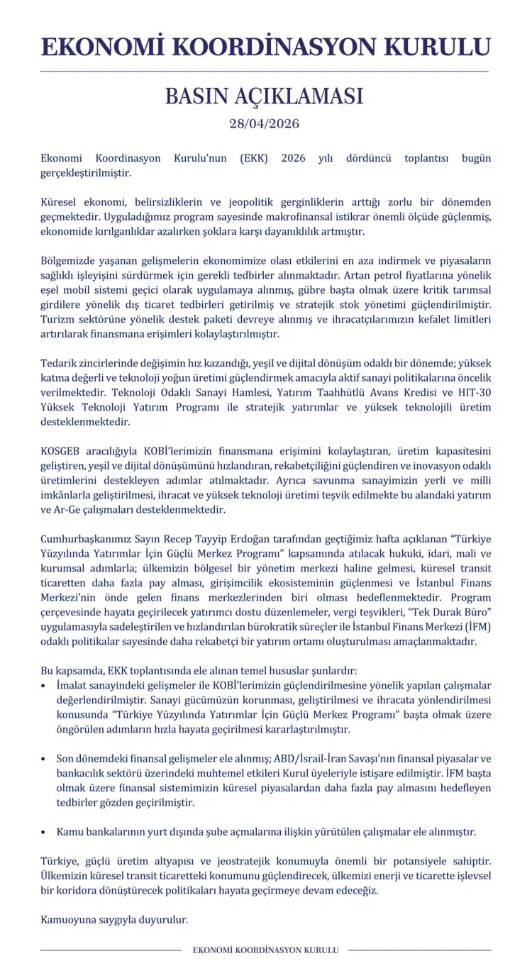 Cumhurbaşkanı Yardımcısı Cevdet Yılmaz başkanlığında toplanan EKK'nın 2026 yılı 4. toplantısında; imalat sanayi, KOBİ'ler, finansal gelişmeler ve ABD/İsrail-İran Savaşının piyasalar üzerindeki olası etkileri kapsamlı şekilde değerlendirildi.