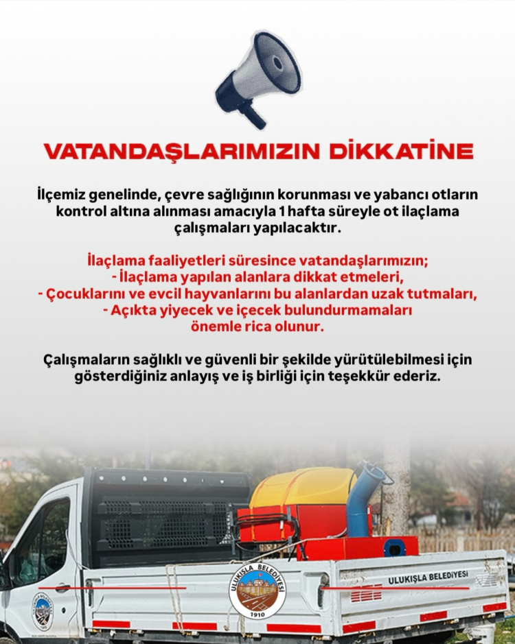 Ulukışla genelinde çevre sağlığının korunması ve yabancı otların yayılımının önlenmesi amacıyla ot ilaçlama çalışmaları başlatılıyor. Ulukışla Belediyesi tarafından yapılan duyuruya göre, çalışmalar ilçe genelinde 1 hafta boyunca devam edecek.